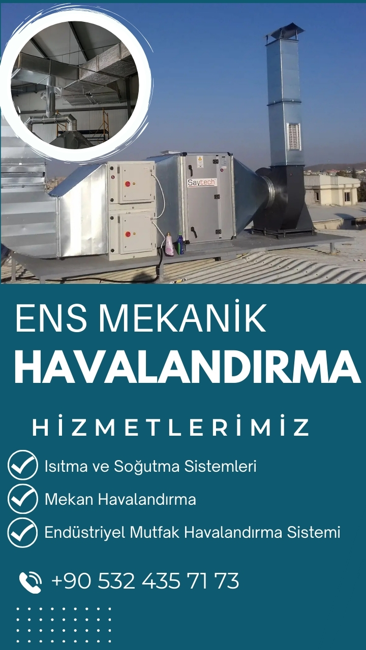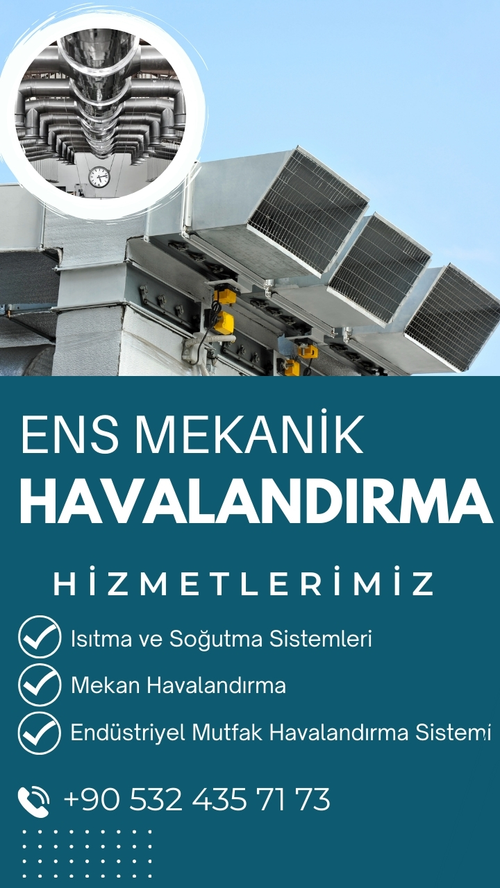Ens Mekanik Havalandırma, endüstriyel ve ticari yapılarda havalandırma ve mekanik tesisat çözümleri sunan, alanında deneyimli bir firmadır. Havalandırma sistemleri, egzoz ve taze hava uygulamaları, kanal imalatı ve montaj süreçlerinde projeye özel çözümler üretir. Kaliteli malzeme, doğru mühendislik ve temiz işçilik anlayışıyla; verimli, uzun ömürlü ve yönetmeliklere uygun sistemler kurmayı hedefler. Zamanında teslim ve müşteri memnuniyeti odaklı hizmet anlayışıyla güvenilir bir çözüm ortağıdır.